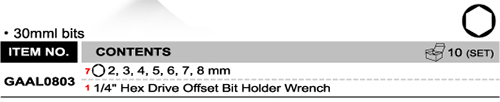 Bộ vít lục giác 8PCS 1/4" 30mm GAAL0803