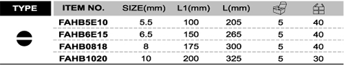 Model: FAHB5E10 FAHB5E10 / FAHB6E15 / FAHB0818 / FAHB1020 Kích thước FAHB5E10: 1.0x5.5x100(L1)mm |